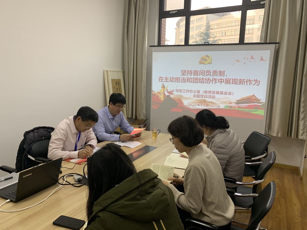 为进一步加强作风建设,增强全体党员的责任意识和服务意识,提升部门效能和服务质量,12月28日下午,校友办(基金会)党支部全体党员在综合服务楼2012开展“坚持首问负责制,在主动担当和团结协作中展现新作为”主题党日活动。