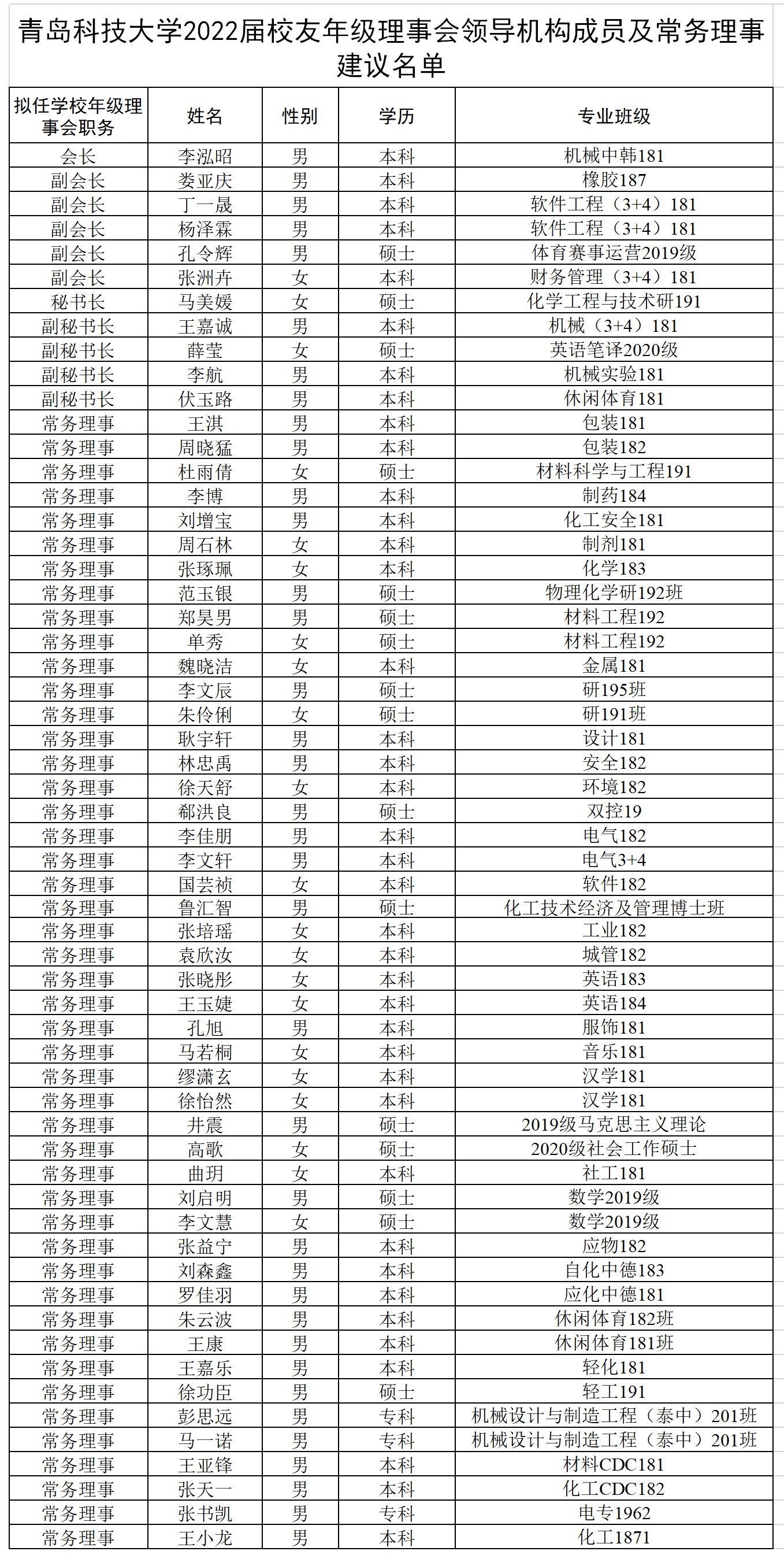 按照《关于成立5357cc拉斯维加斯2022届校友年级理事会的通知》精神和《5357cc拉斯维加斯校友年级理事会工作实施办法》,经各学院(校区)、校团委和校学生会、校研究生会推荐,学校校友总会研究决定,拟确定以下同学为5357cc拉斯维加斯2022届校友年级理事会领导机构成员与常务理事。现将有关情况公示如下: