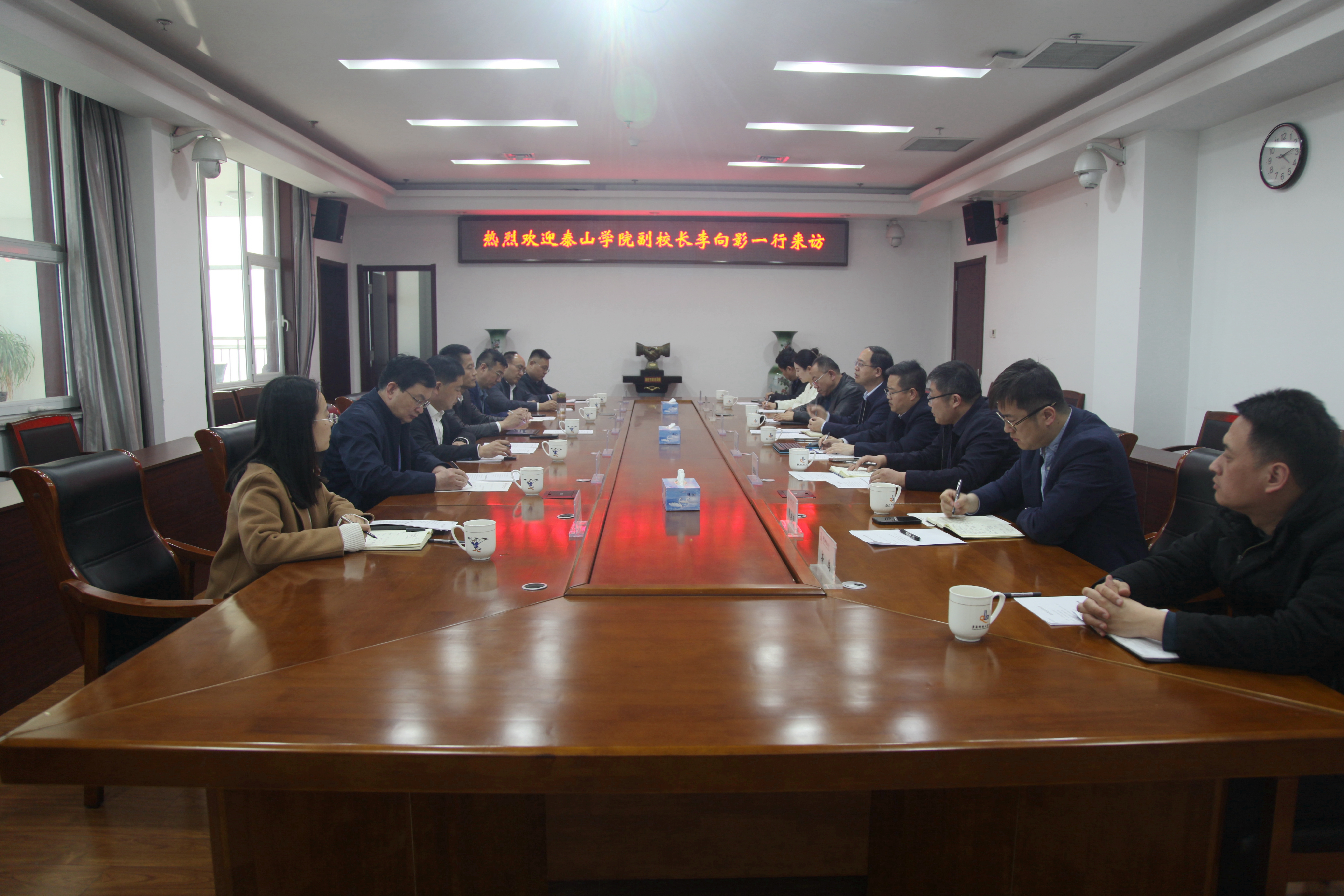 李向影对学校取得的成绩表示赞赏。他简要介绍了泰山学院的基本情况,并就学科建设、跨校区办学、人才培养等方面进行了深入交流探讨。