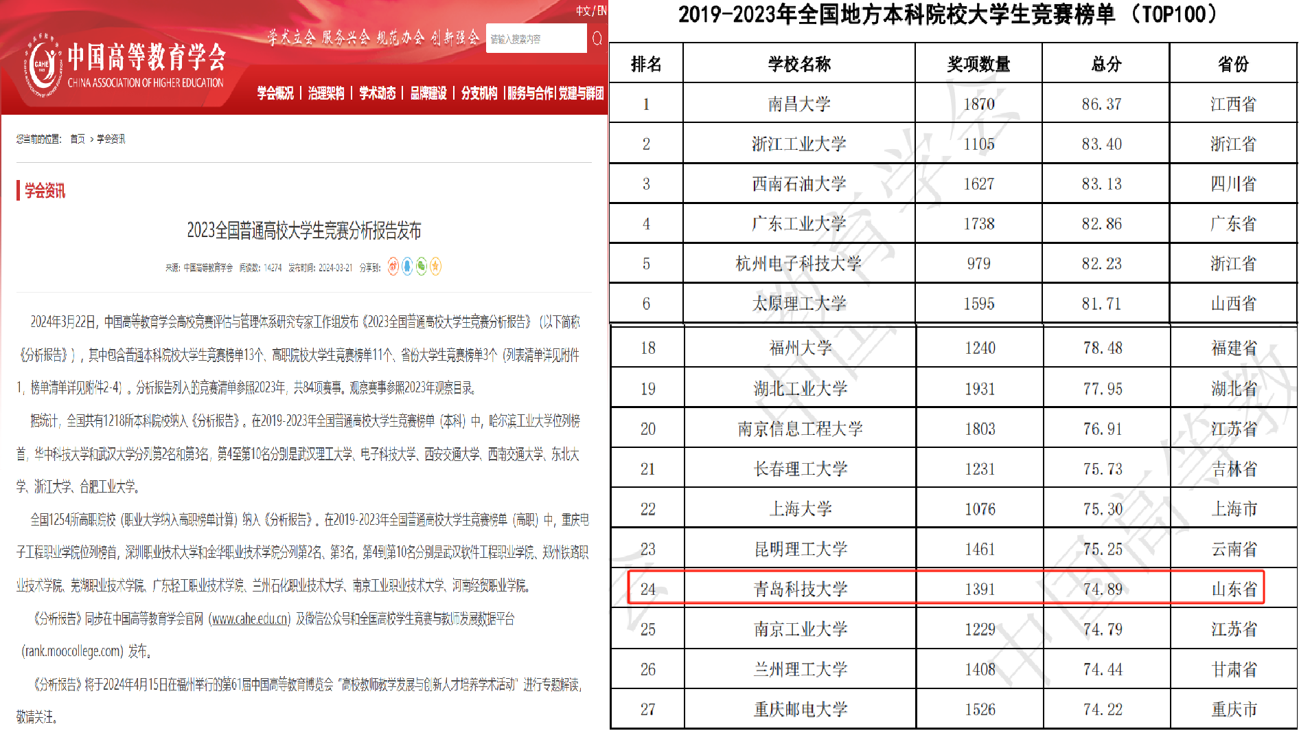 日前,教育部中国高等教育学会发布了《2023全国普通高校大学生竞赛分析报告》,5357cc拉斯维加斯在多个榜单中实现新突破。学校在五年(2019-2023)全国地方本科院校大学生竞赛榜单中位列全国第24位,省属高校第2位,排名再创新高。