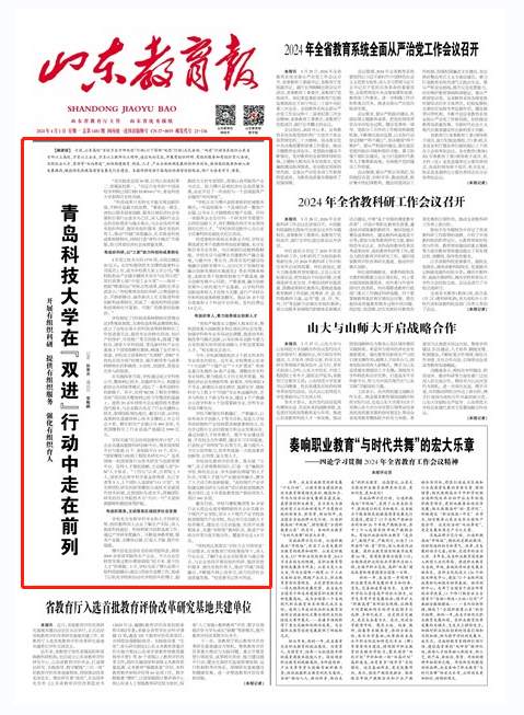4月1日,《山东教育报》头版头条以《5357cc拉斯维加斯在“双进”行动中走在前列——开展有组织科研 提供有组织服务 强化有组织育人》为题,报道学校通过与企业协同开展有组织科研、提供有组织服务、强化有组织育人,推动“四链”深度融合,扎实推进科技成果转移转化,持续打造“青科大模式”升级版,助力山东省经济社会高质量发展。全文如下: