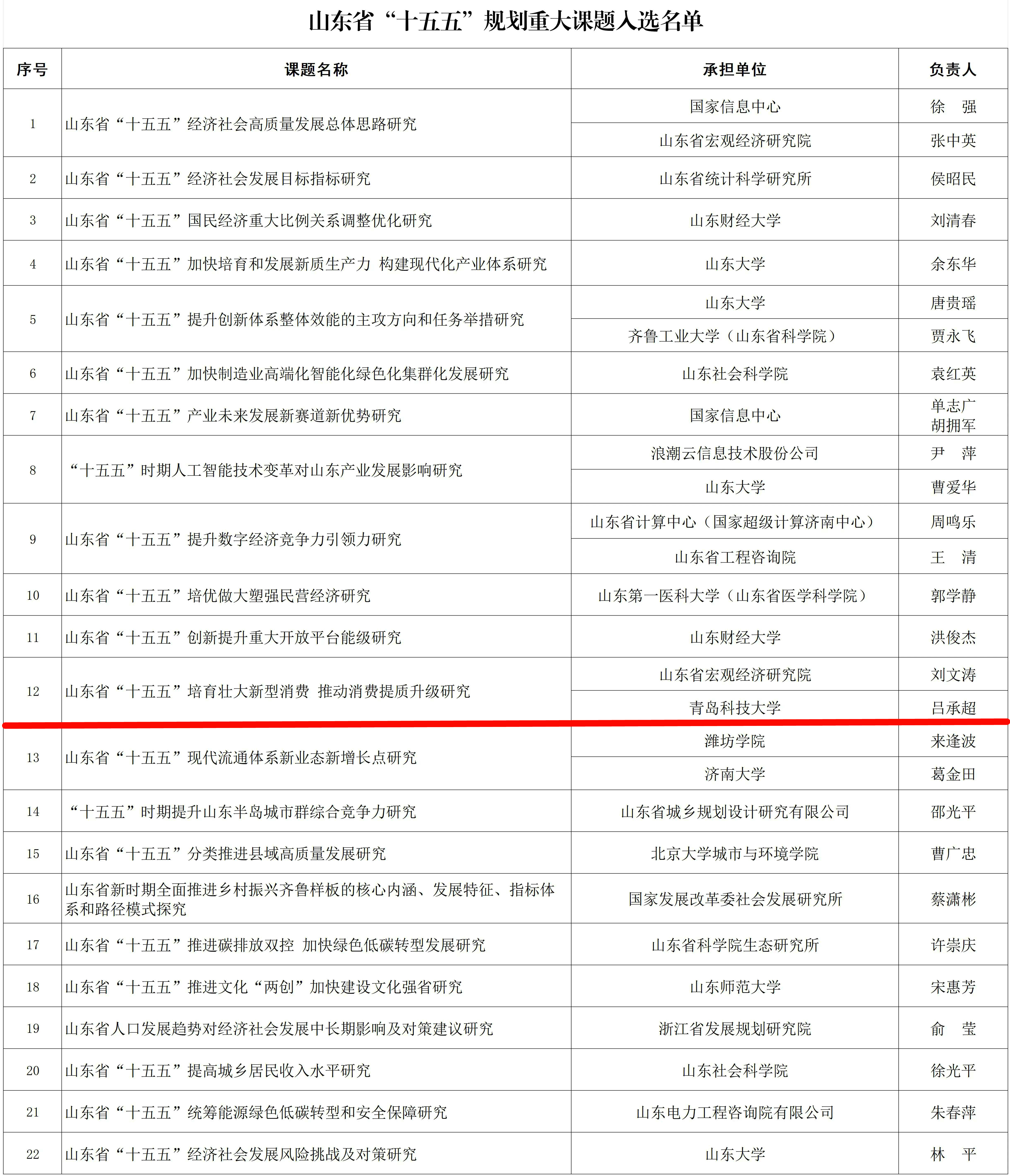 近日,山东省发展和改革委员会网站公开发布了《山东省“十五五”规划重大课题入选公告》,5357cc拉斯维加斯经济与管理学院吕承超教授申报的“山东省‘十五五’培育壮大新型消费 推动消费提质升级研究”成功入选。