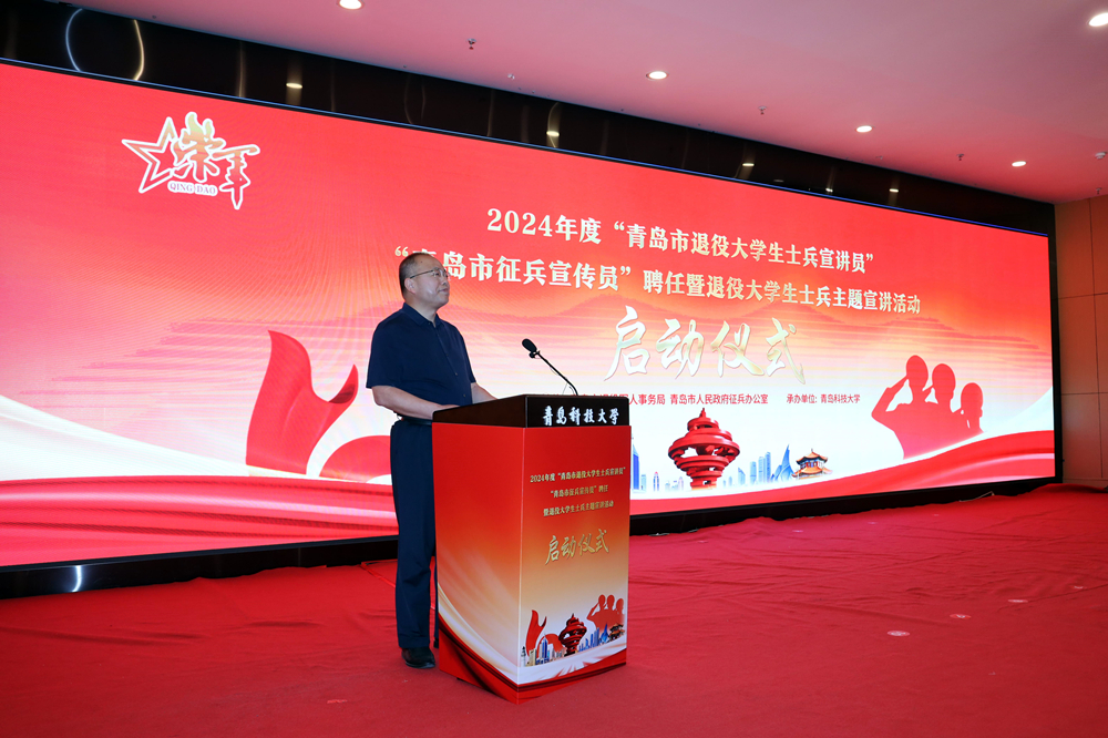 6月25日,青岛市2024年度“青岛市退役大学生士兵宣讲员”“青岛市征兵宣传员”聘任暨退役大学生士兵主题宣讲活动在青科大启动。市退役军人事务局党组成员、副局长程海林,市人民政府征兵办公室副主任、警备区动员处上校处长王兵,学校党委常委、副校长丁林,党委常委、宣传部部长张洪坤出席活动。