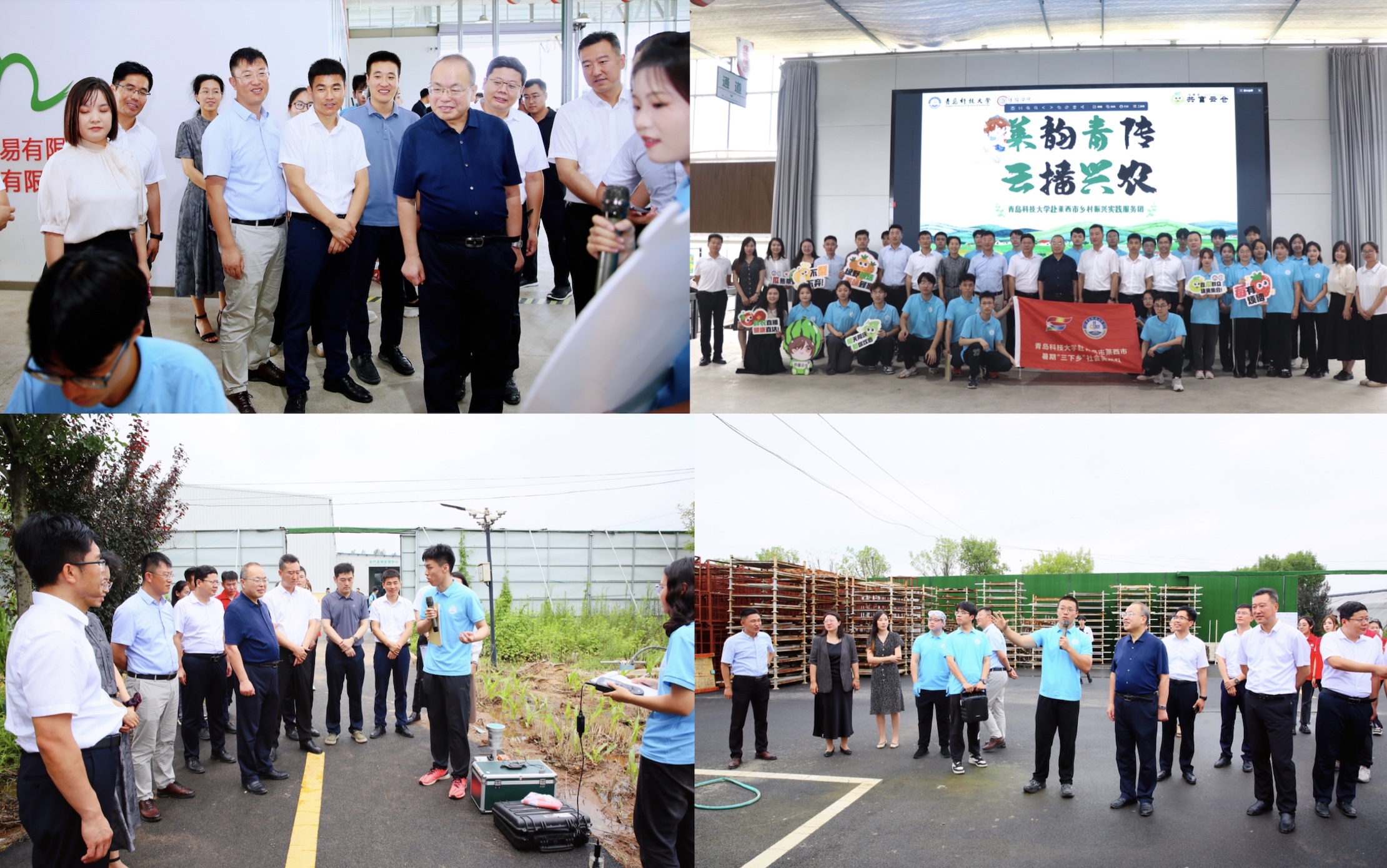仪式后,与会领导、青年师生在马连庄镇河崖红色教育基地开展爱国教育现场教学,并赴青岛扶贫产业园马连庄镇共富云仓观摩环境学院“乡村振兴 环测护‘仓’”、高分子学院“除旧迎新团”以及传媒学院“莱韵青传 云播兴农”社会实践队工作情况。