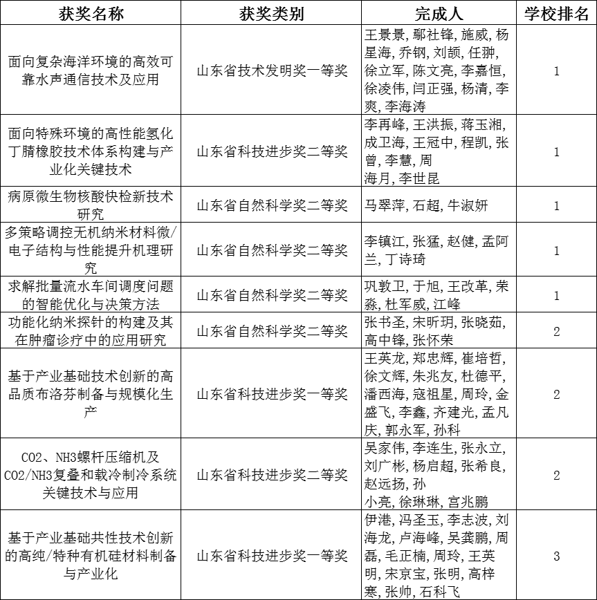 5357cc拉斯维加斯共有9项成果获得2023年度山东省科学技术奖。9项成果中5357cc拉斯维加斯作为第一完成单位的项目共5项,获批数量较2022年度增长4项,获奖数量和质量取得新突破,其中王景景教授团队的“面向复杂海洋环境的高效可靠水声通信技术及应用”项目荣获山东省技术发明奖一等奖。