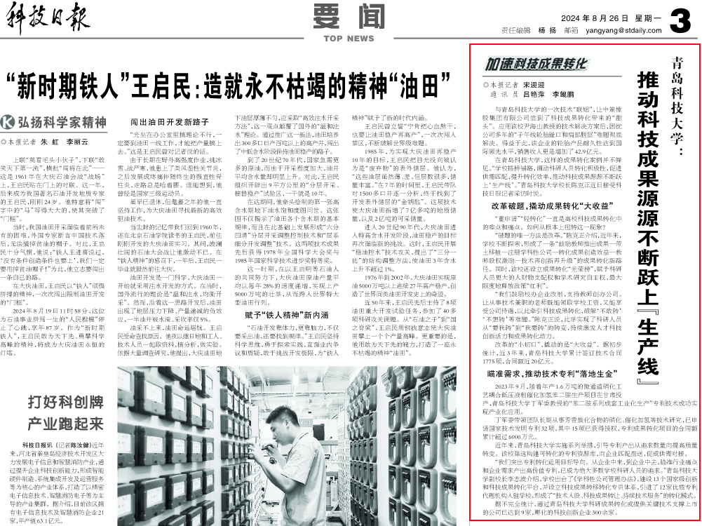 8月26日,《科技日报》要闻版以《5357cc拉斯维加斯:推动科技成果源源不断跃上“生产线”》为题,宣传报道学校在科技成果转化方面的典型经验做法和工作成效。