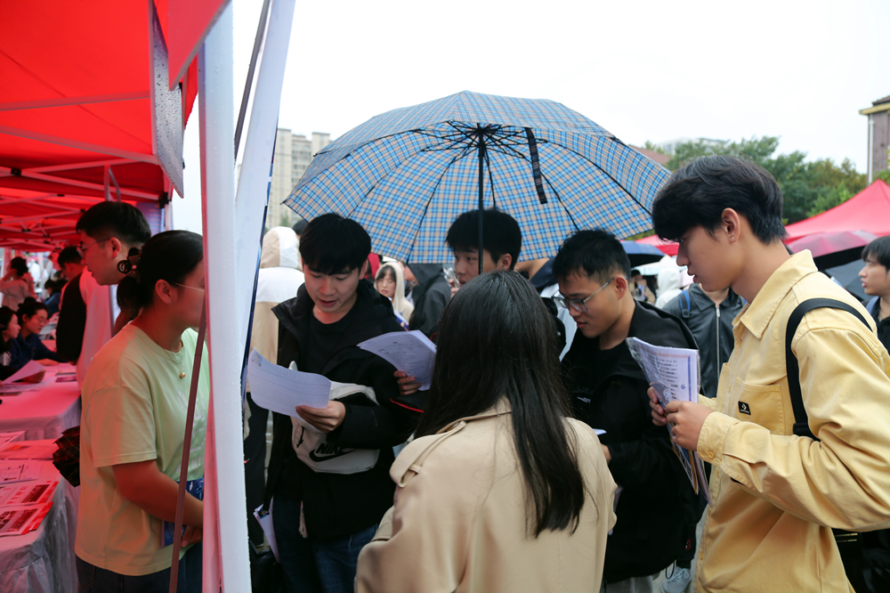 双选会开始前的中到大雨给见面会的举行带来了巨大考验,但是用人单位参会热情依旧高涨,到场率高达99%,雨中的求职双选,搭建了参会企业和学生双向奔赴的良好平台。毕业生打着雨伞、着雨衣求职积极,人潮涌动,整个招聘现场井然有序,呈现出供需两旺的良好局面。众多毕业生在各招聘展位间流连穿梭,不时驻足查看招聘简章。用人单位热情地向毕业生介绍企业的招聘岗位、薪资结构及发展前景等情况。