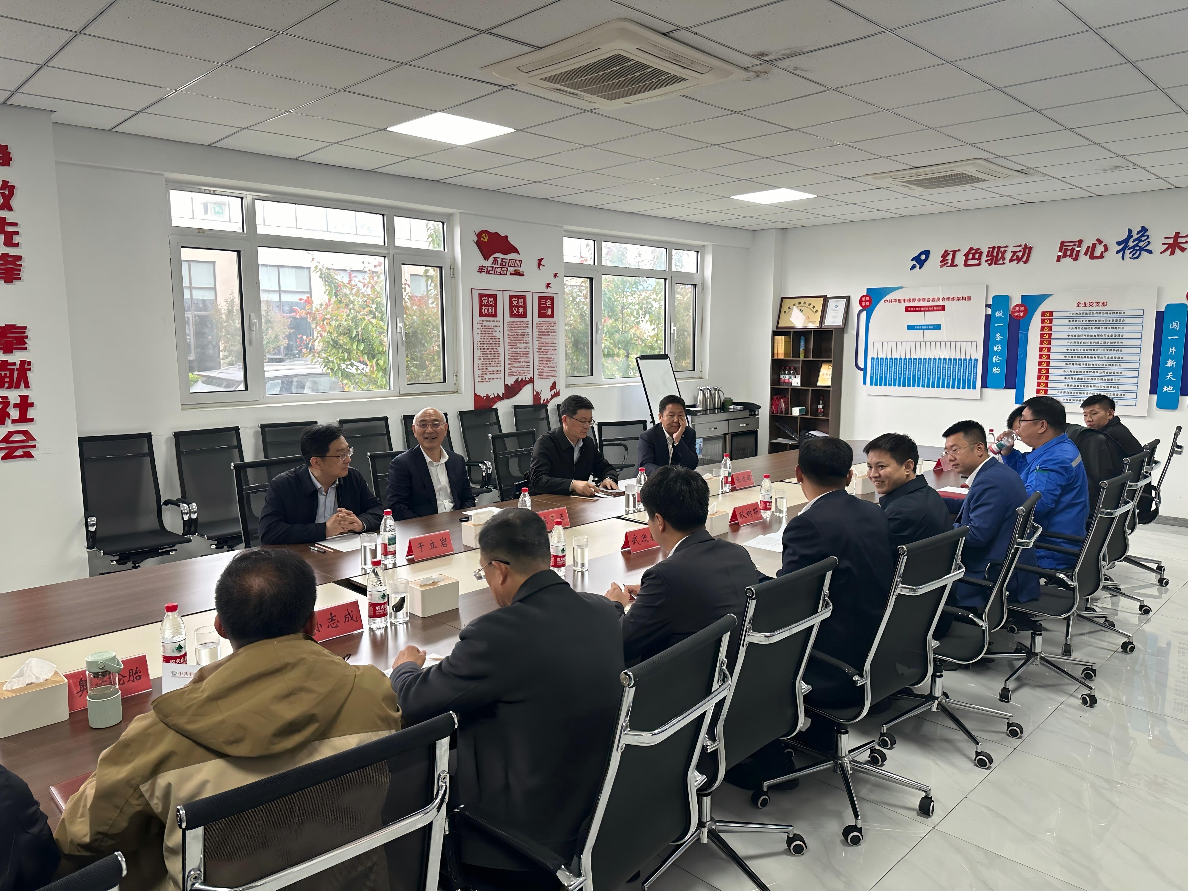 陈克正一行与平度市橡胶业商会代表进行了座谈,围绕发挥学校橡胶学科优势特色,赋能橡胶产业转型升级、助力“卡脖子”关键核心技术突破等进行了深入交流,并看望了学校校友。