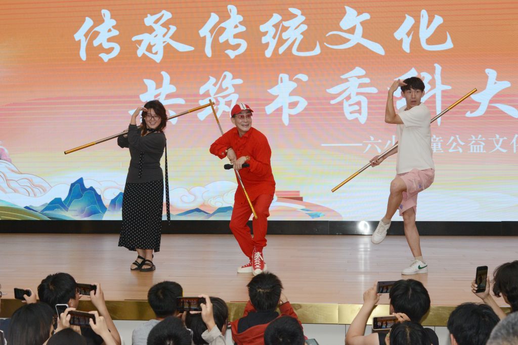 在“科大讲坛”上,身着红色外套的六小龄童精神矍铄,不断向现场观众挥手致意、合影留念。随着六小龄童一声“俺老孙来也”经典台词喊起,引发现场观众热烈鼓掌欢呼。六小龄童以“传承传统文化 共筑书香科大”为主题,讲述了《西游记》拍摄幕后故事、猴戏艺术渊源、个人从艺感悟,分享阅读对其艺术创作和人生成长的影响,鼓励大家多读书、悟经典,从传统文化中汲取勇敢、正义、执着的力量。活动期间穿插“美猴王”经典动作表演,六小龄童手持金箍棒,火眼金睛的神韵、行云流水的动作重现了荧幕中“美猴王”的灵动风采,现场师生踊跃参加互动表演,将活动推向高潮。