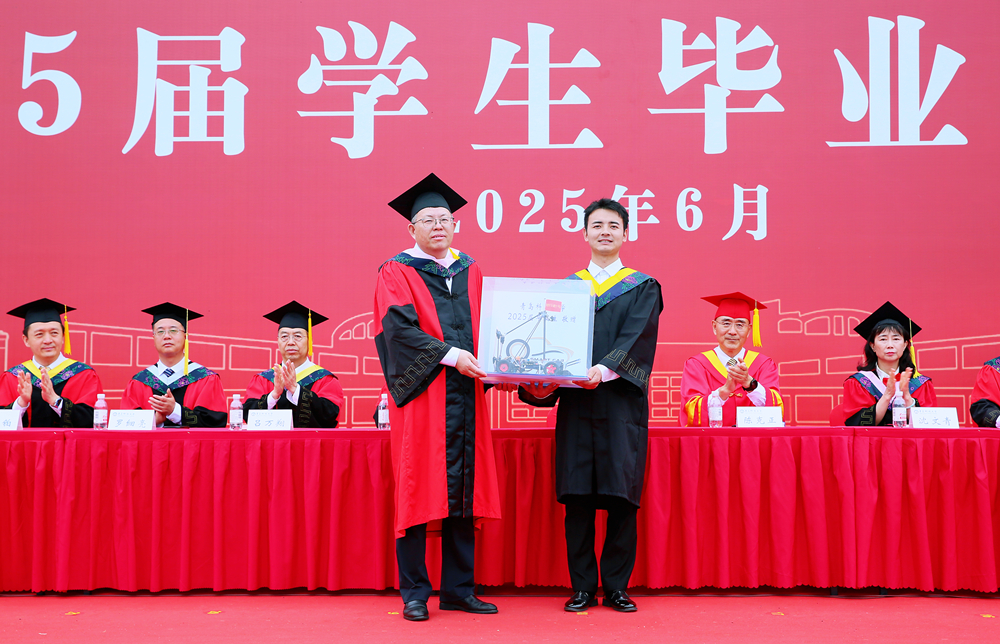 校长、校学位评定委员会主席陈克正向2025届毕业生表示热烈祝贺,向所有为毕业生成长成才辛勤付出的师长、父母、亲朋表示衷心感谢。他以“践行橡胶品格 铸就出彩人生”为主题,给2025届毕业生上最后一堂思政课,并与全体毕业生重温了“橡胶品格”——“吃苦耐劳、坚韧不拔,朴实无华、甘于奉献,同心协力、勇承重载”。