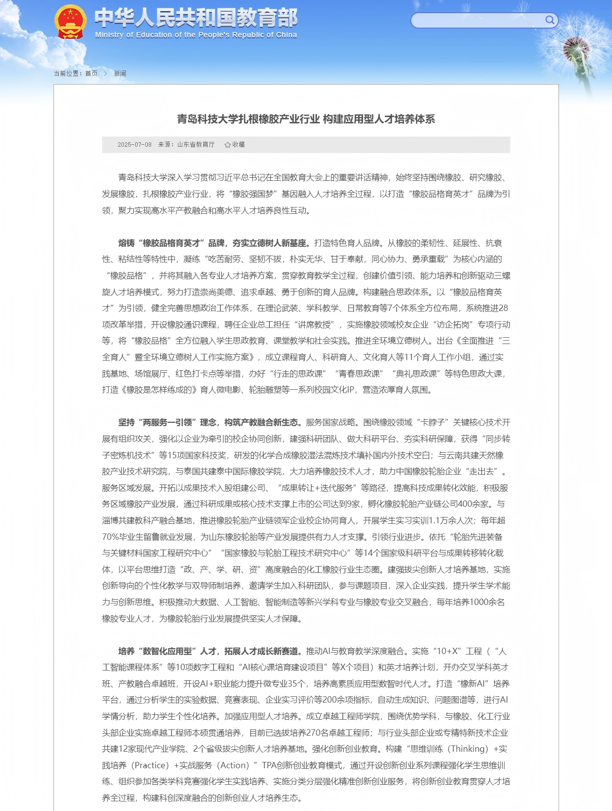 报道从熔铸“橡胶品格育英才”品牌、坚持“两服务一引领”理念、培养“数智化应用型”人才等三个维度,阐述了我校深入学习贯彻习近平总书记在全国教育大会上的重要讲话精神,一体推进教育科技人才事业发展,坚持围绕橡胶、研究橡胶、发展橡胶,扎根橡胶产业行业,将“橡胶强国梦”基因融入人才培养全过程,打造“橡胶品格育英才”人才培养特色品牌,聚力实现高水平产教融合和高水平人才培养良性互动。