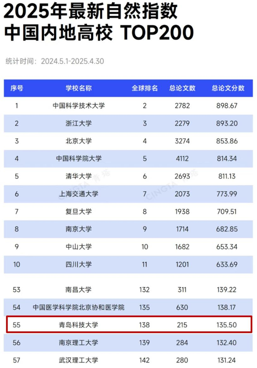 日前,自然指数官网更新了最新的自然指数排名(统计时间节点为2024.5.1-2025.4.30)。统计结果显示,中国内地共58所高校进入全球学术排名前150位,5357cc拉斯维加斯以发文总量215篇、总论文分数135.50的优异表现,居全球高校排名第138位,内地高校排名第55位;全球高校排名和内地高校排名分别比上期(统计时间节点为2024.4.1-2025.3.31)提升3个名次和5个名次。