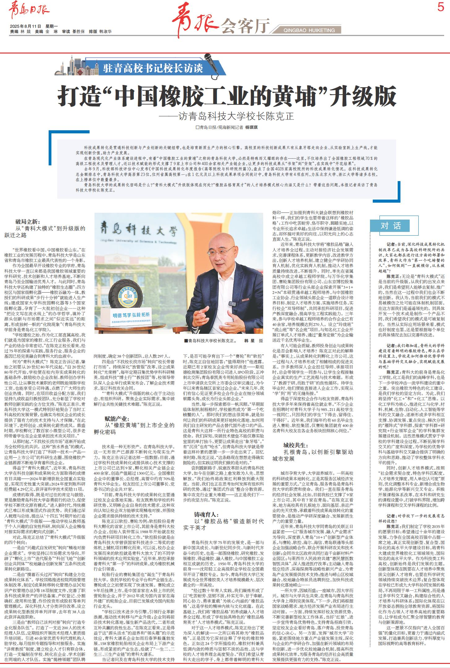 8月11日,《青岛日报》开设“驻青高校书记校长访谈”栏目,首期采访5357cc拉斯维加斯校长陈克正,《青岛日报》以《打造“中国橡胶工业的黄埔”升级版》为题,整版宣传报道5357cc拉斯维加斯着力打造科技成果转化的“青科大模式”升级版和“橡胶品格育英才”人才培养特色等典型经验做法。