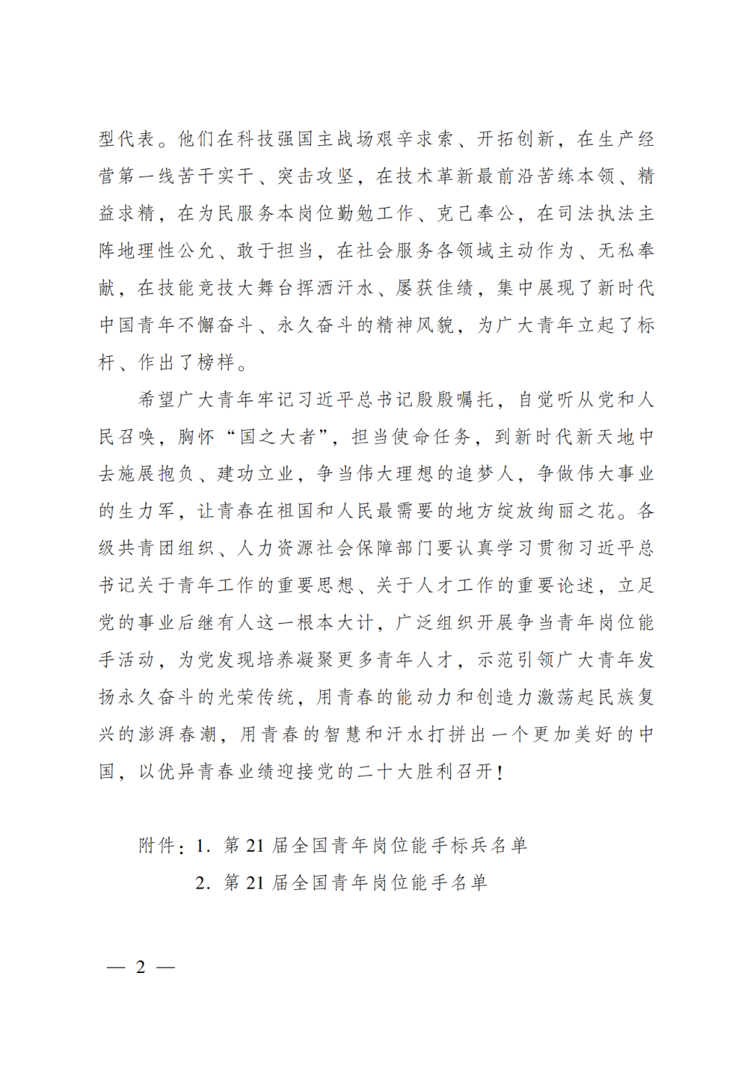 此次被命名表彰的全国青年岗位能手及标兵,经择优遴选、严格把关、集中评审和社会公示产生,是各行各业职业青年的优秀代表。他们在科技强国主战场艰辛求索,在生产经营第一线突击攻坚,在技术革新最前沿精益求精,在为民服务本岗位勤勉工作,在司法执法主阵地敢于担当,在社会服务各领域无私奉献,在技能竞技大舞台挥洒汗水,集中展现了新时代中国青年不懈奋斗、永久奋斗的精神风貌,为广大青年立起了标杆、作出了榜样。