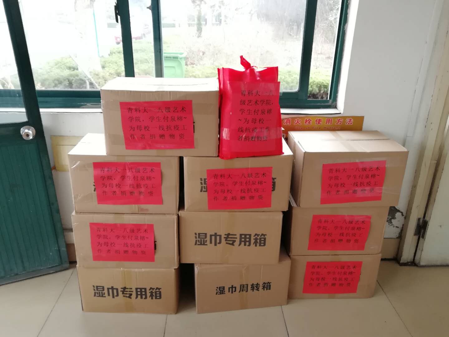 3月9日,青科大高密校区艺术系2018级学生付泉榕向学校捐赠了募集到的防疫物资——医用消毒纸巾10箱、口罩500个。