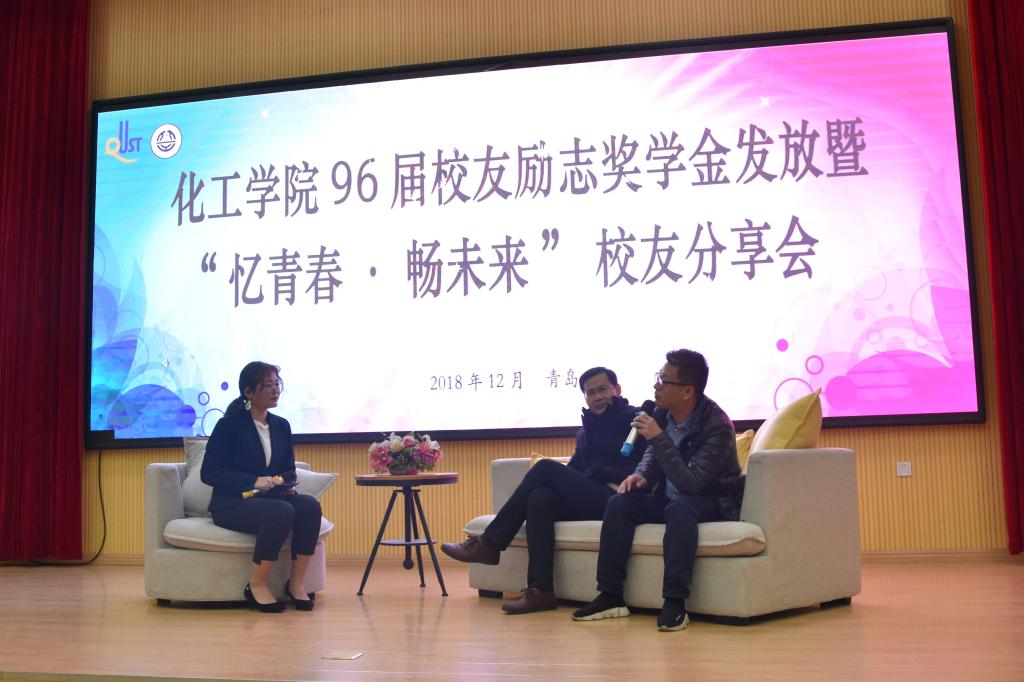 12月7日下午,化工学院96届校友励志奖学金发放暨“忆青春,畅未来”校友分享会在四方校区讲学厅举行。化工学院96届校友代表宣宗伟、王光状、鞠继恩、王建芳为30名品学兼优和家庭困难的学生发放奖学金共计3万元。党总支副书记孙明媚,全体辅导员参加了分享会。