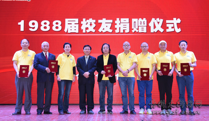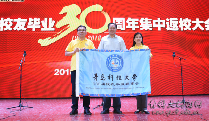 韦殿华为1988届校友年级理事会授旗并讲话。他从学校整体概况、综合改革、合作办学和校友工作等四个方面向校友们介绍了学校的发展情况。他希望,校友们以此次集中返校活动为契机,加强交流,在回顾奋斗历程的同时,进一步为学校发展积极建言献策,继续关心和支持学校的建设与发展,为母校“双一流”和“五有”高水平大学建设贡献力量。