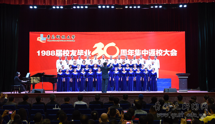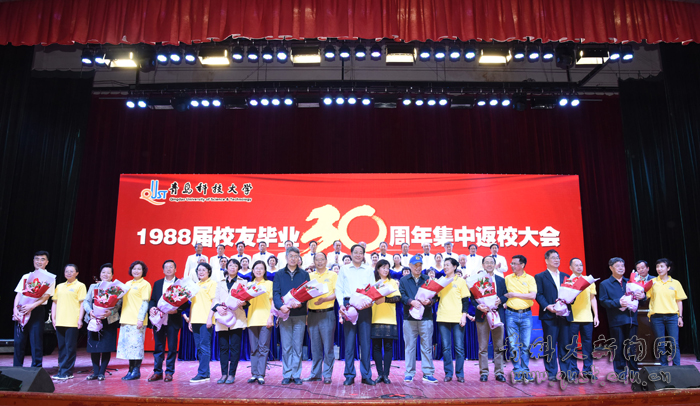 在大会正式开始之前,学校4名校友所在的合唱团为返校大会献上了《青岛梦寻》和《老师我想你》两首歌曲。校友们向当年的老师们献花,感谢师恩,表达祝福。返校大会结束后,校友们分别回到所在的学院,参观了学院楼、实验室、教学楼、宿舍楼,开展了笔会和集体合影等丰富多彩的纪念活动。
