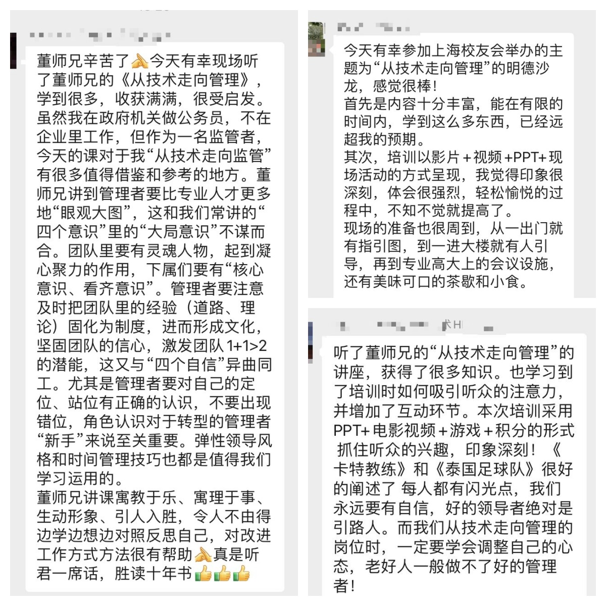 董栗序校友从角色认知、专业型高手的六个习惯、管理者四项基本功等维度,对技术岗如何快速转型到管理岗进行的详细的阐述。为了让讲课过程更加生动,栗序校友在活动前就提供给大家提前观看影片《卡特教练》,并就其中的团队管理理念和方法进行深入剖析。此外,沙龙活动中充分运用案例分析、游戏互动、视频播放、角色扮演、小组竞赛等综合性方式,让校友在轻松愉悦的气氛中吸收管理汲养,深刻领会如何才能更好地适应、发挥管理者角色,让大家受益匪浅,赢得阵阵掌声和一致好评。